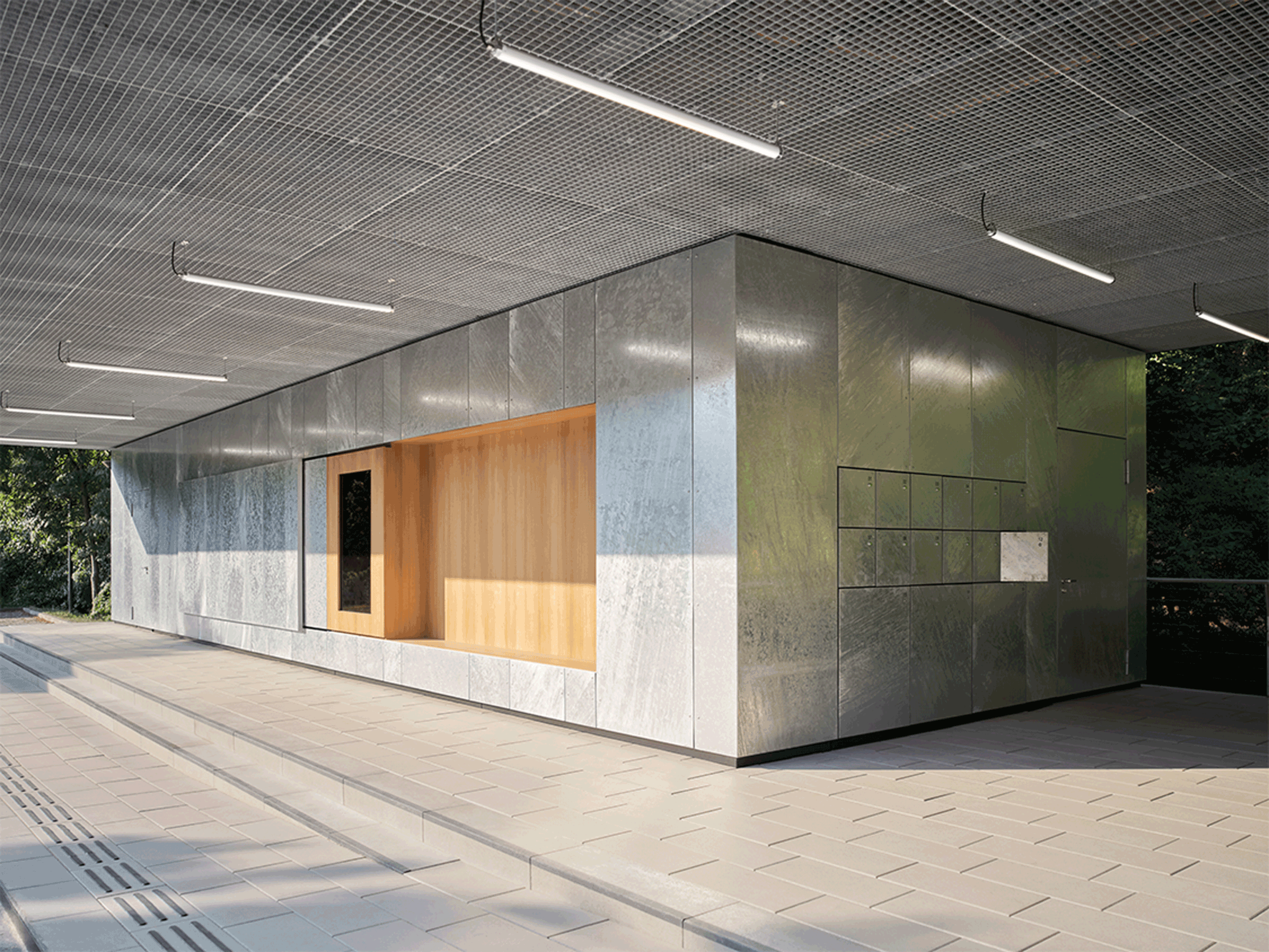 Zwei divergente Fassadenarten greifen den Schwerpunkt des Museums, die Metallverarbeitung, auf. Durch deren Materialkontrast spannt sich zwischen Dachvolumen und Gebäudesockel ein Transitraum auf, der die BesucherInnen in das Museum überführt.