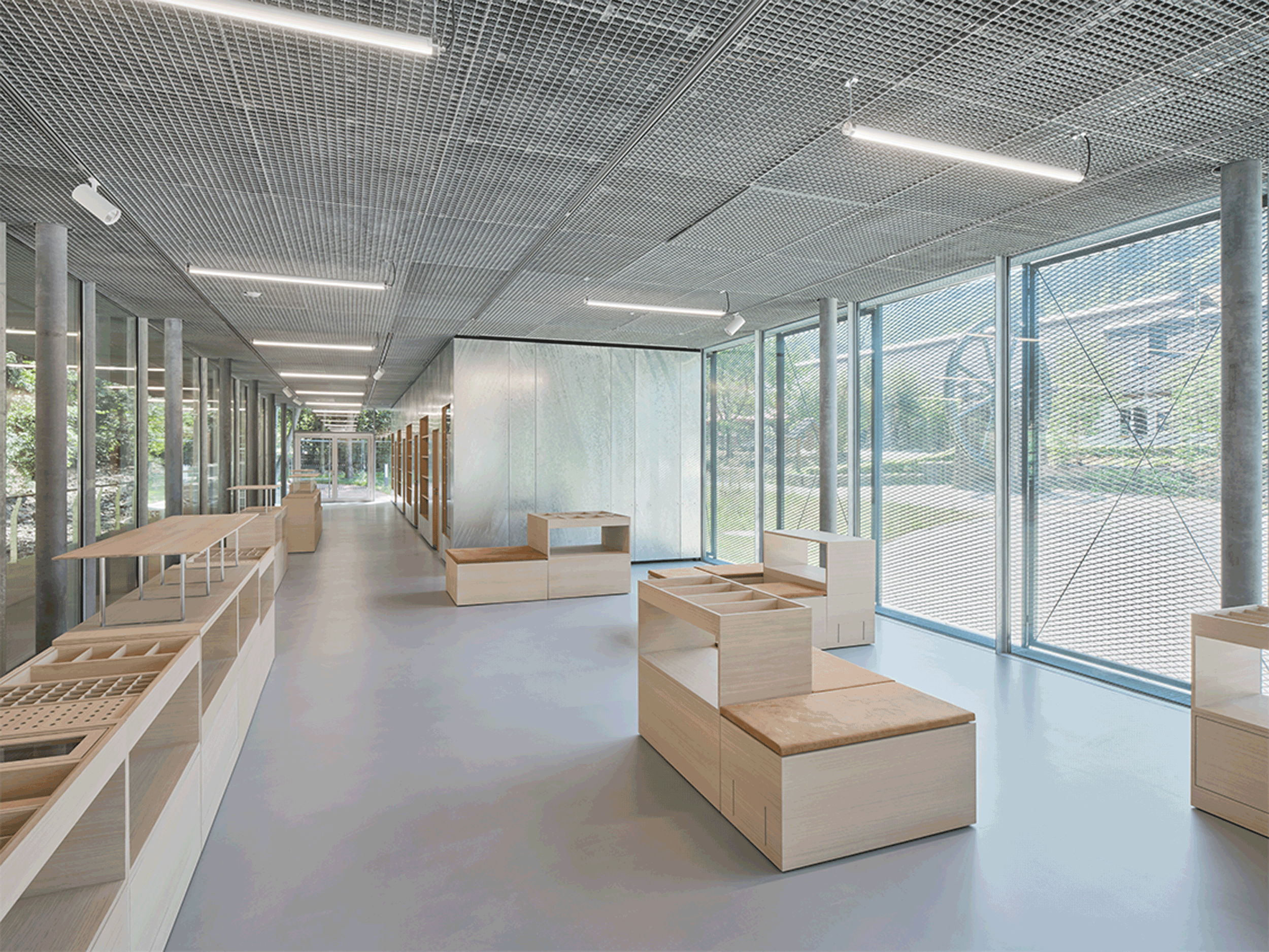 Die Baukörper bilden einen zusammenhängenden Transitraum. Gegliedert durch drei Funktionskerne und unterschiedliche Fassadenschichten entsteht eine räumliche Sequenz aus fließend ineinander übergehenden Raumzonen.