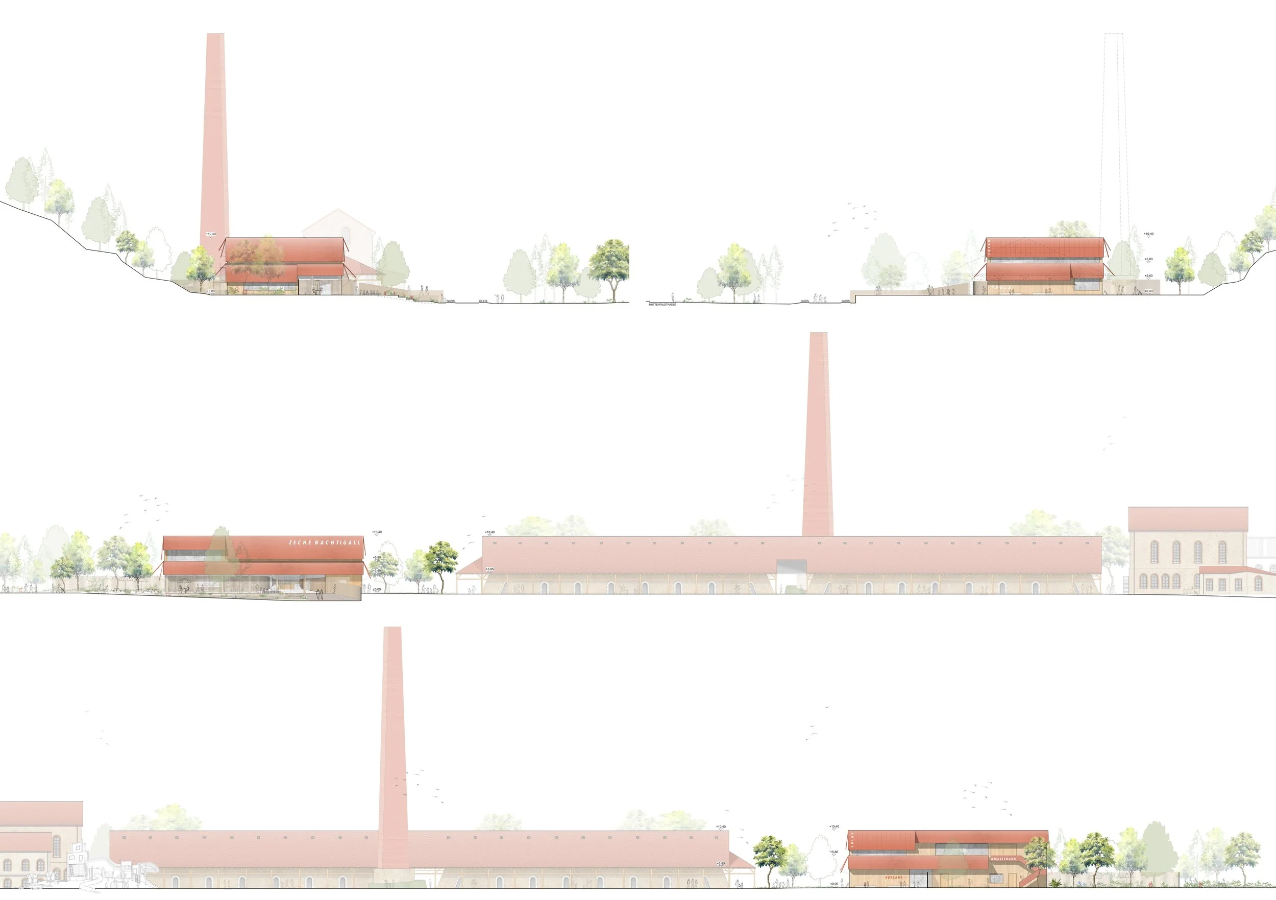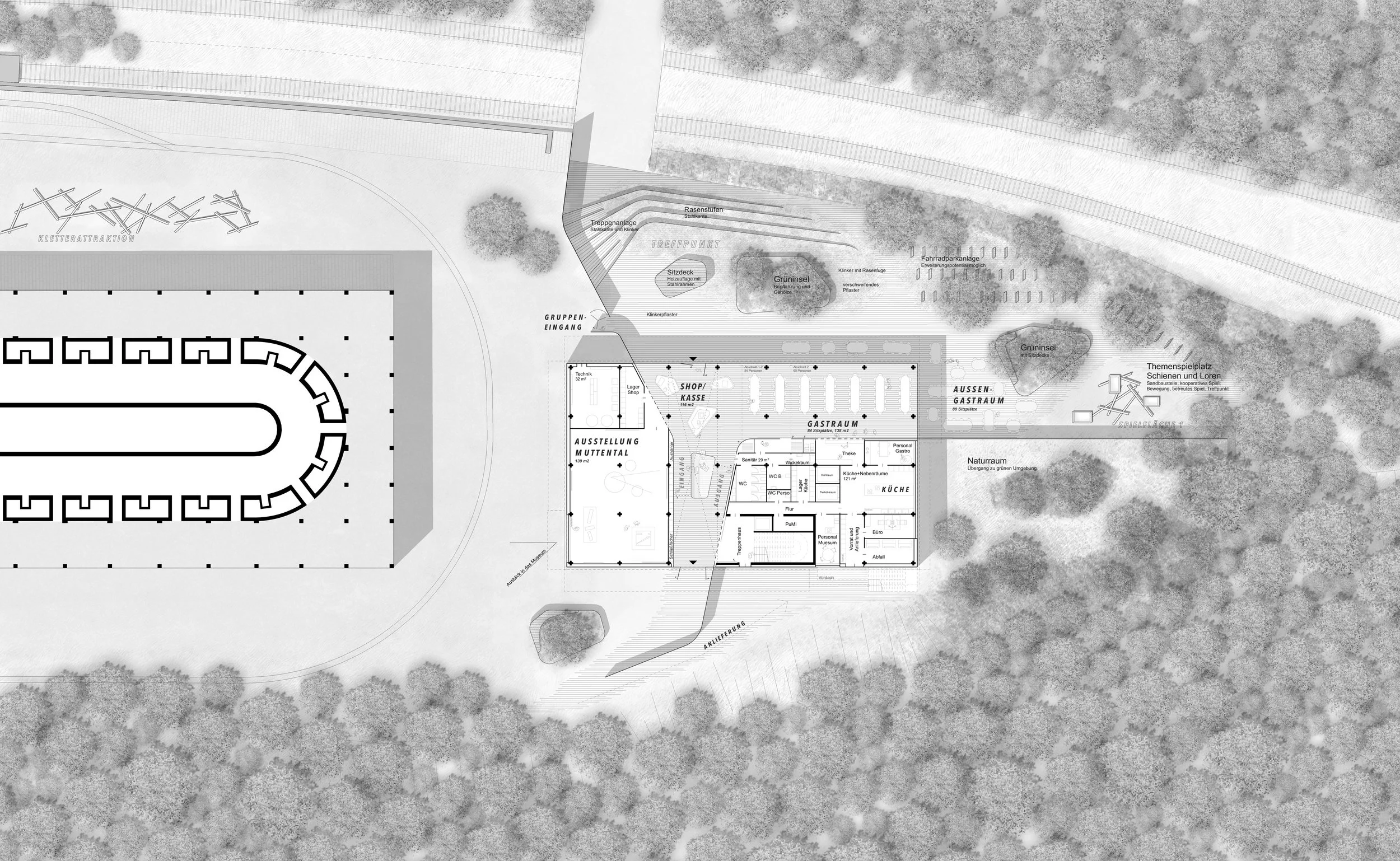 Das neue Besucherzentrum wird respektvoll neben der geschützten Ringofenanlage platziert. Durch seine Ausformulierung kann es neben ihr bestehen und eine adäquate Adresse bilden ohne sie zu überstrahlen. Es wird als zeitgemäße Ergänzung verstanden, die das Bestehende aufgreift und weiterdenkt. Es steht zum Bestand parallel aber zurückgesetzt. So wird die Ecksituation des Denkmals freigestellt und schon beim Ankommen erlebbar. Diese Wirkung wird durch die Einbindung der Topografie noch verstärkt.
