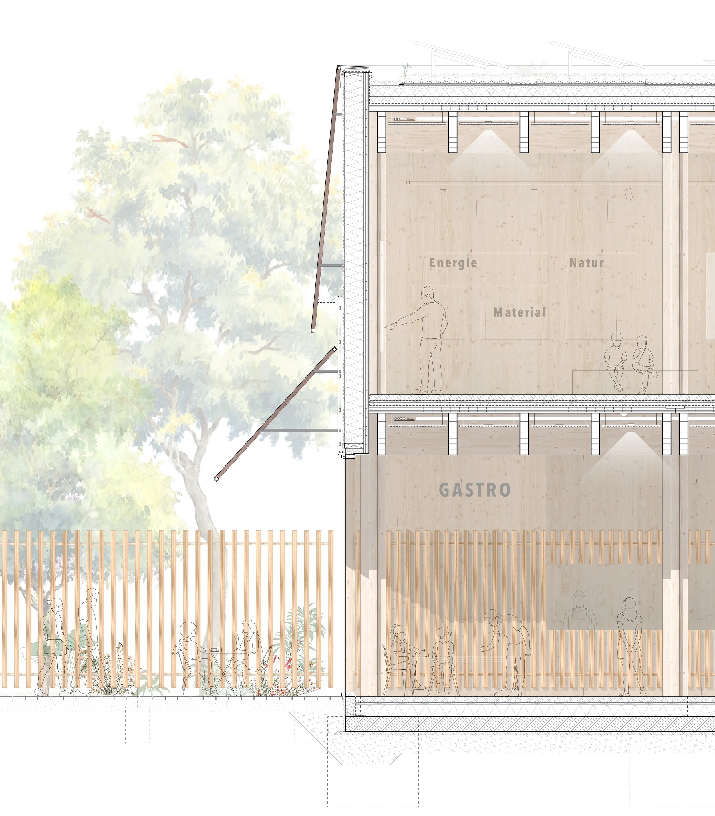 In zwei horizontale Bänder unterteilt, öffnet sich die Fassade je nach Erfordernis. Auf diese Weise werden Ausblicke erlaubt, Vordächer geschaffen, Verschattungselemente und PV-Flächen generiert. Für die Außengastronomie und den Eingang bildet die Hülle ein Vordach, dass auch bei schlechter Witterung einen Aufenthalt erlaubt und zugleich im Sommer vor Überhitzung schützt. Es definiert die Eingangsgeste. Aus der kostenlosen Ausstellung inszeniert es den Einblick ins Museum. Eine Aufforderung einzutreten.
